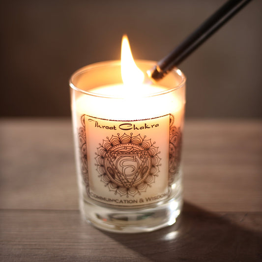 Prabhuji Throat Chakra Vishuddha | Candle for Chakra Meditation Scented with Essential Oils | Woods & Amber | Communication and Wisdom - 10.5oz